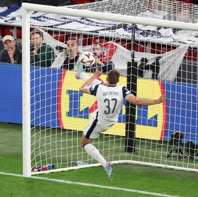 这是比赛第69分钟,曼联的任意球吊入禁区,维卡里奥出击扑救失误,霍伊伦轻轻跃起,准备将球顶入空门。眼看着皮球即将入网,范德文小碎步后撤,腾空而起,用潇洒的凌空侧身勾球,将霍伊伦的必进之球解围!